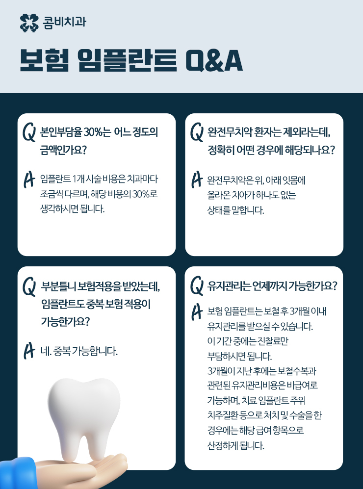 하지만 이 노인임플란트 건강보험 혜택을 받기 위해선 몇 가지 조건이 있는데 완전 무치악 상태, 즉 모든 치아가 없는 경우는 제외되고 일부 치아가 남아 있어야 임플란트 혜택 대상이 돼요. 무치악 상태인 분들은 오히려 틀니 보험 대상자가 되기 때문이며 주의해야 할 점은 잇몸뼈 상태가 좋지 않은 경우에 뼈이식과 같은 추가적인 치료가 필요할 수 있는데 추가적인 치료가 적용되는 항목에 대해서는 별도의 비용이 든다는 점은 잘 체크해야 해요