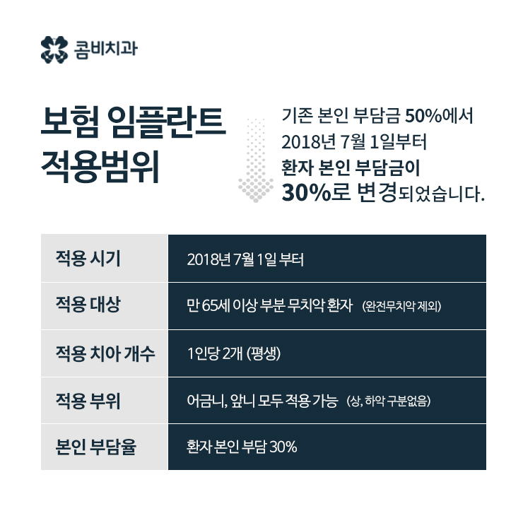 현재 기준으로 만 65세 이상이라면 노인임플란트 건강보험 혜택을 받을 수 있으며이 만 65세 생일이 지난 날 이후부터 적용이 가능하며 평생 2개까지만 지원돼요. 그리고 본인부담률은 30%로 임플란트 치료비에서 30%만 내가 지불하고 나머지는 건강보험에서 부담하니 치아 상실로 고민하는 노년층에게 실질적인 큰 혜택인 것이죠