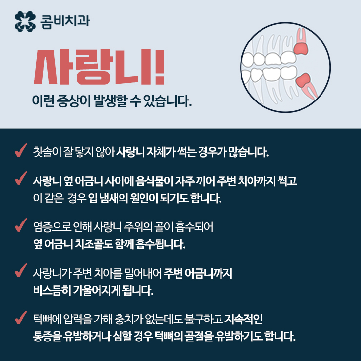 충치가 생기기 쉬운 위치라는 점도 사랑니가 문제되는 이유로 사랑니는 입 안 가장 안쪽에 위치해 있어서 칫솔질이 쉽지 않은 경우가 많아요. 특히 사랑니가 비스듬히 나와 있으면 음식물이 더 잘 끼고 충치가 생겨도 초기에 알아차리기 어려워요.